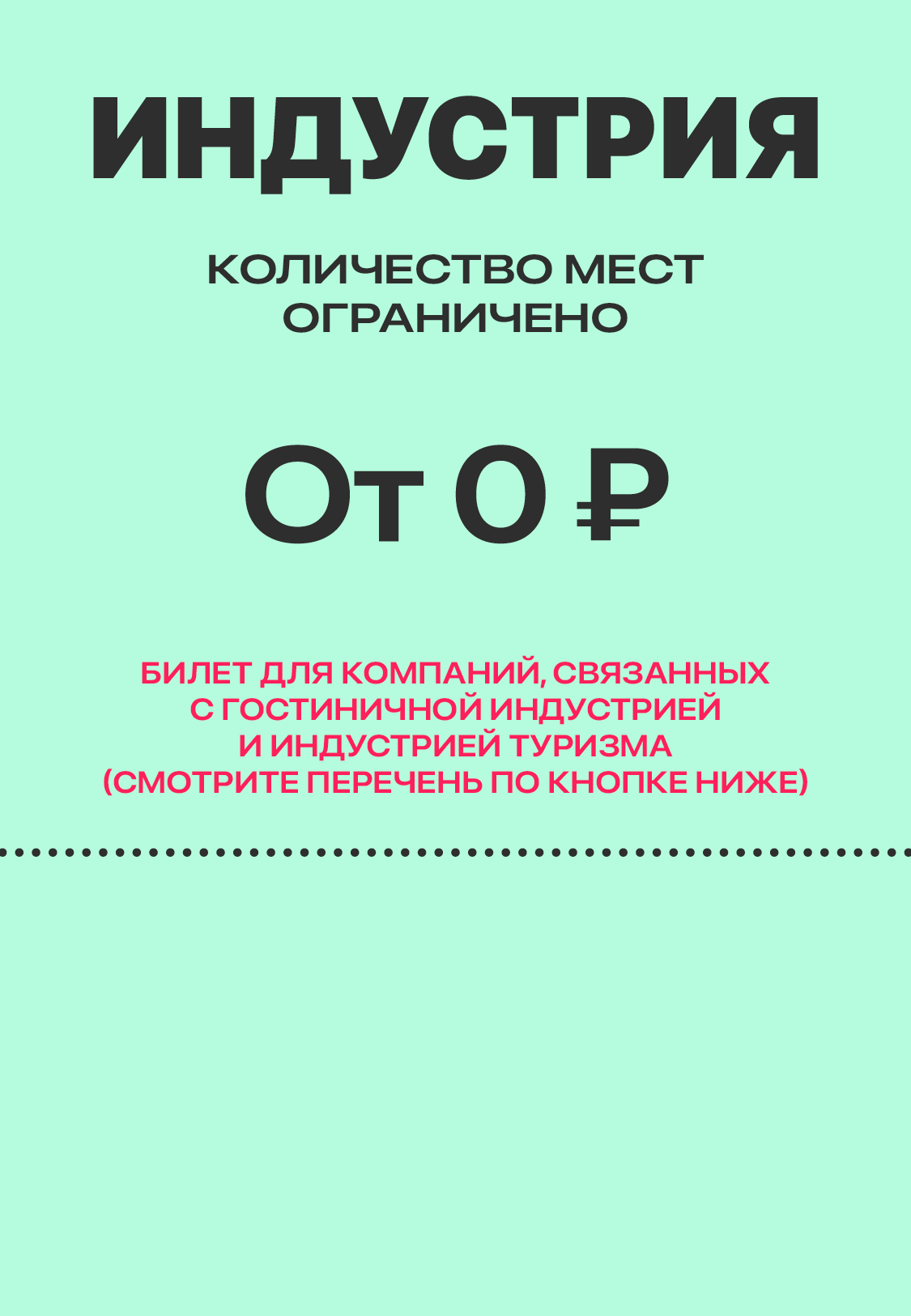 Билет «Индустрия» — для представителей гостиничной индустрии, индустрии туризма, а также смежных сфер (смотрите точный список всех, кого мы рады видеть, в описании билета). Регистрация только на корпоративный адрес электронной почты участника. Не подходит для поставщиков товаров и услуг для гостиничного бизнеса!
